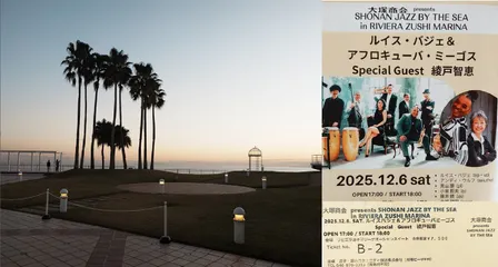 逗子の夕暮れにラテンのリズム 逗子、毎月訪れる大好きな場所、穏やかな海岸線は土曜日の夕暮れです。 今日のライブはラテン、”ルイスバジェ&アフロキューバミーゴス”、 tp・sax・vib・pf にラテンリズム、ソウルフルな大阪のおばちゃん綾戸智恵さんがSpecial Guest。 ソルテラで303km、パ