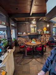 以前にも紹介したことがありますが京都国際会館近くにある ドルフ 冬場は暖炉に火が入るそうでランチに伺いました ハハはビーフシチューセット撮ってからベアちゃん忘れた😭と暖炉と一緒にもう一枚 女子力高めの息子はハイティーセットどちらもあまりお値段変わりません💦 シ