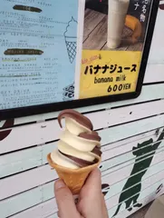 バナナチョコソフト🍦 門司港のカフェで、バナナチョコソフト🍦を頂きました😋あちこちの店でバナナのお菓子やドリンクが多く売られて居ました「寄ってらっしゃい見てらっしゃい、南蛮渡来のバナナだよ、バナナが安いよ🍌」と言ったかどうか、九州・門司港は バナナの叩き売り 発祥地だそうです冬空の下、バナナの叩き売りをしてる姿は、ありま