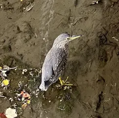 野鳥 あまり見かけない鳥が居たのですが名前が分からないので問い合わせてみました 写真を拝見しました。この鳥は「ゴイサギ」というサギの仲間です。サギというと首の長い大きな鳥というイメージがありますが、ゴイサギはカラスよりも少し大きいくらいで、首も短めです。成鳥と幼鳥で羽の色や模様が大きく異なるのが