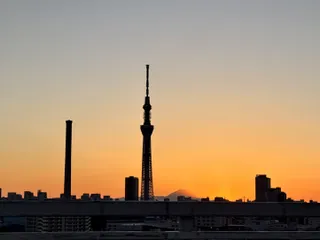 NEW スカイツリー 仕事で移動中の首都高川口線葛飾ハープ橋付近より。スカイツリーと富士山です☺️