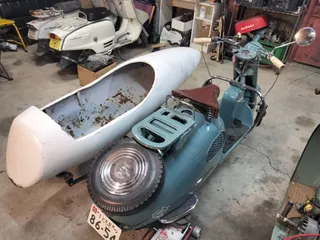 1953年頃、ラビットスクーターのオプションとしてサイドカーの設定があったことをご存知の方は少ないでしょう。 米軍向け軍用機の落下タンクを転用したと伝わるDS-1という製品です。(真偽不明) 実用性の割にかなり高価だったと思います。生産台数は200台程度で