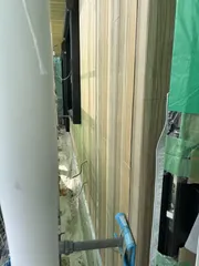 外壁工事施工 自宅の進捗状況報告です。月曜日に外壁工事始まりました。内装は床のフローリングを貼ってます。フローリングは、ウォールナットを選びました。ちょっと暗い感じになるかと思いましたが、いい感じになってます。大工さんが工事中に傷つけないようにフローリングに養生を貼ってます。ロフトから撮影しました。全面にフローリ