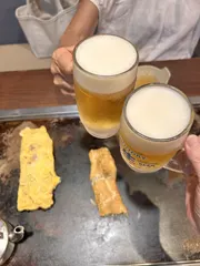 神戸でお疲れアワー🍻 くまこさんと別れて神戸に帰って来ました。Ayakoさんのお家に17時前に着いて、晩ご飯を食べに電車に乗って移動します🚃晩ご飯は、お好み焼きです😋アイキャッチ右側、明石焼きをお出汁でいただきます。美味しい🤤これは何だったかなぁ😅他にも色々と食べましたが、写真がありません😅 店内はなかなかの人