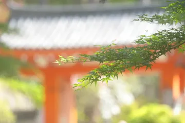 燃える赤と瑞々しい青もみじ:長岡天満宮で感じる春の色彩美♪