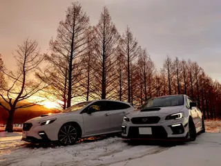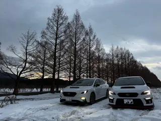 仲間と愉しむ雪景色❄️ 朝陽が昇り始める朝焼けのメタセコイア並木 雪山とオレンジ色に染まるS4とLEVORG ⭐︎撮影エピソード⭐︎雪を狙って朝活したものの曇予報そして到着すると強風で落ちてしまったのか雪の華は無いし、道路も乾いてる…🤣その時メタセコイア並木の木々の間が薄っすらピンク色に染ま